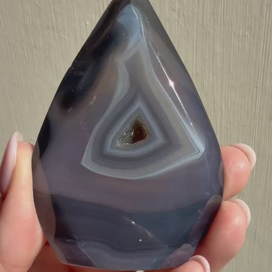 Agate teardrop carvings. There is nice banding and/or quartz druzy in these teardrops. Grays, blues, tan/browns. Agate is a calming, balancing stone. It supports emotional balance, enhances spiritual growth, and promotes a sense of calm. It amplifies the body's healing processes and reduces stress.